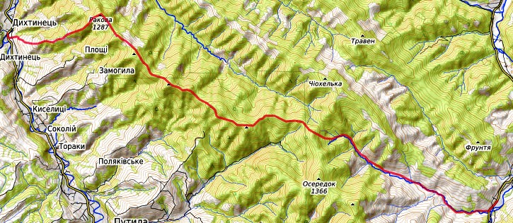 Achtung: Die Dateien sind nach den Erkundungswanderungen 2006 und 2007 an Hand von GoogleEarth und der amtlichen Karte 1 : 100 000 der Ukraine erstellt und mit outdooractive verbessert worden. Für Ungenauigkeiten und Fehler kann daher keine Haftung übernommen werden. Kilometerangaben und Höhenmeter sind als grobe Anhaltspunkte zu verstehen. Städte und Dörfer in den ukrainischen Karpaten können sich über viele Kilometer in den Tälern erstrecken. Je nach Lage des Quartiers verlängern oder verkürzen sich dadurch die Tagesstrecken. Manchmal kann es sinnvoll sein, die Wanderstrecke durch den Ort mit (Privat-)Taxi oder Marschrutka abzukürzen.