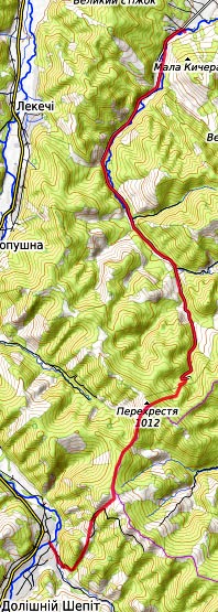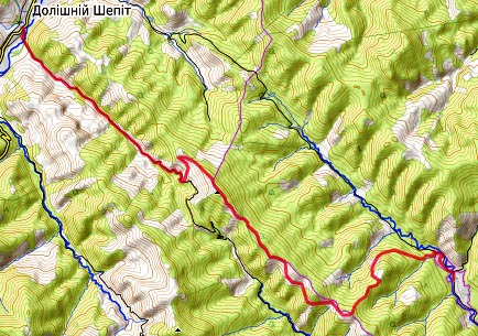 Dolischnij Schepit - Forstweg über den Sereth Richtung SO in das Seitental - nach über 4 km und riesigen Kahlschlägen Forstweg nach links aufwärts zum Bergkamm - auf dem Kamm Richtung SO - etwa 3 km Forstweg auf dem Kamm durch den Wald - weiter 2,5 km Hochweiden - dann nach links und durch den Wald auf dem Rücken Richtung NO hinunter ins Tal des Falkiw-Bachs - Falkiw (Übernachtung)