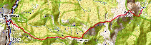 Kvasy - Straßenbrücke über die Schwarze Theiß - nach rechts - unter der Bahn durch - danach nach rechts und auf einem Waldpfad aufwärts - am Waldrand nach links, Hauptrichtung O - vorbei am Funkmast - auf Graswegen und Pfaden auf dem Höhenrücken aufwärts - Wald und Weiden wechseln sich ab -Polonyna Wesnarka (links unten sieht man eine Biosphärenstation) - immer auf dem Rücken bleiben - Kopyzja (1689 m) - Scheschul (1728 m) - der Höhenrücken ändert seine Richtung in NO - Polonyna Schumneska - immer auf dem Kamm bleiben - Aufstieg zum Petros (2020 m)- Abstieg Richtung SO zum Sattel - hier nach links steil hinunter zu den Hütten - Polonyna Holowtscheska (Übernachtung in einfacher Hütte, Zelt oder Biwak)