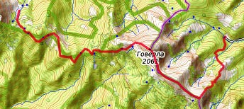 Polonyna Holowtscheska - wieder hoch zum Sattel - weiter auf dem Kammweg (einzelne Gipfel werden umgangen) - Polonyna Skobeska - Biosphärenstation Peremytschka / Informationszentrum - Howerla (2060 m, höchster Gipfel der Ukraine) - Abstieg Richtung SO - Breskul (1911 m) - Poschyschewska (1928 m) - hier nach links, abwärts Richtung NO - Poschyschewska Polonyna, Hochgebirgs-Forschungsstation des Geographischen Instituts der Universität Lemberg - weiter abwärts zur Sportywna Basa Sarosljak, die direkt am jungen Pruth liegt (Übernachtung)