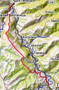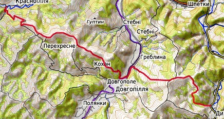 Krasnoilllja - Richtung S auf dem Fahrweg über den Bach und in das Seitental - nach 250 m spitzwinklig nach links und auf dem Fahrweg bergan Richtung SO - auf dem Fahrweg auf dem Hügelkamm oberhalb des Ortes Perechresne vorbei - auf dem Fahrweg auf dem Kamm Richtung SO - hinunter ins Tal des Weißen Tscheremosch (hier verläuft die Westgrenze der Bukowina) - nach links, talabwärts - nach 300 m, nach rechts über die Hängebrücke in die Bukowina - nach links, flussabwärts auf dem Fahrweg - nach über 600 m, kurz vor dem Ort Hreblina, verlassen wir das Tal des Weißen Tscheremosch nach rechts - Fahrweg Richtung SO, später O - etwa 3 km nach Verlassen des Tscheremoschtals rechts ab, bergab Richtung S, später O ins Putylka-Tal - auf der Talstraße nach rechts ins Ortszentrum von Dychtynez (Übernachtung)