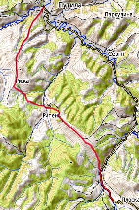 Putyla - Richtung SW auf den Höhenzug links der Putylka - dem Kamm auf dem Fahrweg Richtung SW folgen - bald, nachdem der Fahrweg zum Naturweg wird, am Gehöft Ryschka rechtwinklig nach links und auf Graswegen und Naturpfaden Richtung SO, meist leicht abwärts - am nächsten Fahrweg im Tal von Rypen 200 m nach rechts, dann gleich wieder nach links Richtung O auf die Höhe, zuerst Fahrweg, dann kaum sichtbarer Naturpfad - oben auf dem Kammweg nach rechts - Grasweg Richtung auf dem Kamm Richtung SO - später nach S hinunter ins Tal und auf der Talstraße Richtung S nach Ploska (Übernachtung?)