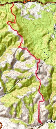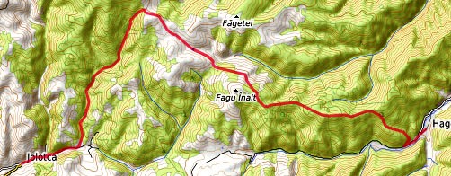 Jolotca - auf dem Fahrweg fast 2 km talaufwärts Richtung ONO zur Streusiedlung Tengheler - nach N ins Tal des Turcul-Bachs - talaufwärts bis zum Vf. Rivo, wo wir auf die alte Markierung rotes Band treffen - nach rechts über die Poiana Lucheneu - Sattel Groapa Pisicii - Fahrweg an der Saua Licheneu - ohne Markierung weiter auf Feldwegen Richtung SO, nördlich um den Fagu Inalt herum - weiter auf Vieh- und Waldpfaden auf dem Kamm Richtung O - Obcina - Achtung: Nie nach N absteigen, im Zweifelsfall auf Wald- oder Holzwegen nach S absteigen (Nordabstiege führen auf unendlich langen Umwegen ins falsche Tal!) - Hagota (Bushaltestelle, Übernachtung - von der Bushaltestelle etwa 1 km der Markierung gelbes Kreuz nach S folgen)
