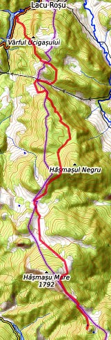 Lacu Rosu - südl. Ortsende, Parkplätze an der Straße unterhalb des Gästehauses Hasmasul Mare - Markierung blauer Punkt (bis zur Poiana Alba!) - vorbei an den Felswänden des Vf. Ucigasului - Saua Ghilcos - Poiana Chercului - Saua Paleu - Poiana Scaunul Rau - Sattel zwischen Muntele Rotund und Hasmasul Negru - Poiana Alba - Markierung rotes Band - Hasmasul Mare - Saua Curmatura - Piatra Singuratica ( bewirtschaftete Hütte, Übernachtung)