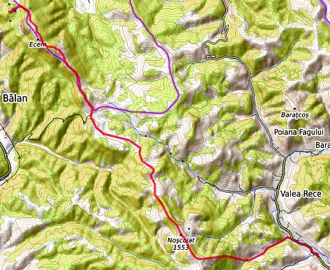 Piatra Singuratica - Markierung rotes Band (bis zum Abstieg vom Noscolat!) - Ecem - Lik - Poiana/Saua Tarcau - Vf. Noscolat - etwas mehr als 1 km nach dem Gipfel des Noscolat ohne Markierung nach links weglos über die Weiden auf dem Seitenkamm Richtung O - nach rechts hinunter ins Salamas-Tal - Fahrweg talabwärts ins Haupttal Valea Rece - nach rechts auf der Straße zum Quartier in Valea Rece (Übernachtung)