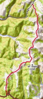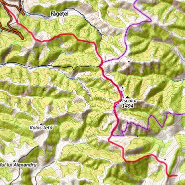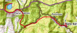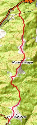 Alternative: Kurz nach Passieren des Vf. Viscolul zweigt ein mit dem roten Kreuz markierter Weg nach W ab - dieser Markierung folgen bis zum Vf. lui Alexandru (hier stehen Schweizer Eisenbahnwagen auf dem Berg ?!?!) - kurz danach ohne Markierung links abwärts auf Feldwegen nach Potiond (Abholung durch Privattaxi problemlos möglich, evtl. sogar Übernachtung?)