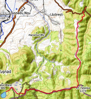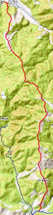 Valea Rece - von der Talstraße ins Valea Cremenil - auf dem Talweg talaufwärts - am Talschluss auf Pfaden durch den Wald aufwärts zu den Hochweiden auf dem Kamm nördlich des Vf. Trei Pietre - nach rechts zur Crucea Condra - ab jetzt Markierung rotes Band auf dem Kammweg, zunächst Richtung W, dann Hauptrichtung S - Vf. Buciului - Fagul Mic - an der Wegkreuzung im Sattel zwischen Vf. Rez und Muntele Utusoi nach links, ohne Markierung ins Utusoi-Tal - talabwärts ins Valea Garbea, das wir beim Bahnhof erreichen - hier nach rechts auf der Straße talabwärts in den Ort (Übernachtung, Bahnstation, Bushaltestelle)