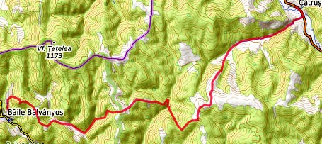 Baile Balvanyos - Markierungen blaues Band und rotes Kreuz zur Ruine der Cetatea Balvanyos - zurück zum Kammweg, nach rechts, ab jetzt ohne Markierung, 1,5 km auf dem Kamm - am Ende der Hochweide nach links hinunter ins Tal - auf dem Talweg nach rechts abwärts - nach etwa 1 km nach links in das Seitental - nach etwa 650 m nach rechts hinauf auf die Hochweide - in Hauptrichtung O überqueren und wieder ins Tal - am Gegenhang wieder hoch auf die nächste Hochweide - in Richtung NO - ins Tal hinunter, talabwärts - an der Mündung ins Haupttal nach links zu den Quartieren in Catrusa (Übernachtung)