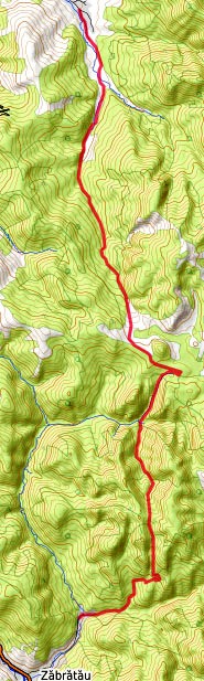 Zagon - vom südöstlich Ortsrand auf dem Fahrweg entlang des Baches Zagonul Mare - bei der ersten Talgabelung gleich nach dem Ort nach rechts Richtung S - das ganze Tal aufwärts bis zu den Hochweiden - die Hochweide queren - abwärts bis zu den Hütten, wo wir auf einen Weg treffen - hier nach rechts und auf dem Fahrweg hinunter ins Tal - unten in der großen Kurve nicht weiter talabwärts sondern am Gegenhang hoch und weiter Richtung S - Abstieg ins Valea Zabratau (Übernachtung, Bushaltestelle in etwas mehr als 2 km Entfernung an der Hauptstraße von Zabratau, Bus nach Kronstadt/Brasov einmal täglich um 10 Uhr, Stand 2021)