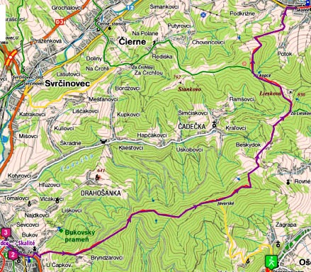 Cadca Bahnhof - grüne Markierung - Cadca Tesco - rote Markierung - Javorske - Beskydok - Za Lieskovou - Tri kopce - Skalite (Übernachtung, Bahnstation, Bushaltestelle)