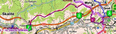 Skalite - rote Markierung - Skalite-Serafinov - gelbe Markierung - Zwardon (Übernachtung, Bahnstation, Bushaltestelle) - rote Markierung - Zwardon / Chata Dworzek Beskidzki (Übernachtung)