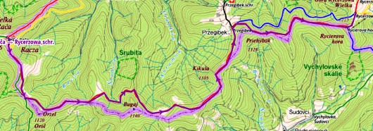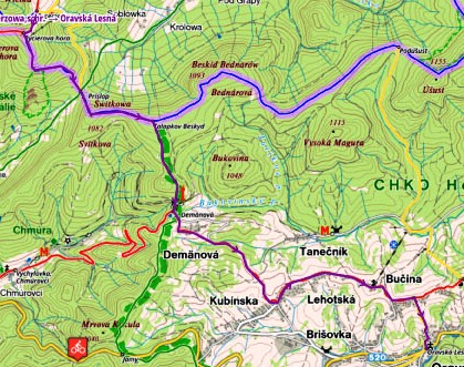 Rycerzowa Schronisko -rote Markierung - Rycierova hora – blaue Markierung (Grenzweg) - Sedlo Prislop - Svitkova - Bukowina/Talapkov Beskyd – grüne Markierung - Demänova – rote Markierung - Kubinska - Lehotska – Bucina - gelbe Markierung - Oravska Lesna (Übernachtung)