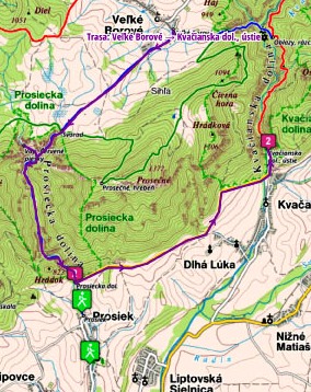 Velke Borove – blaue Markierung - Svorad - Vodopad Cervene piesky - Prosiecka dolina – gelbe Markierung - nach Überquerung des Kvacianka-Bachs nach rechts in den Ort Kvacany (Übernachtung). Alternativ kann nach der blauen Markierung nach Prosiek (Übernachtung) oder weiter nach Brnice (Übernachtung am Liptauer Meer) gewandert werden. Dann am nächsten Tag wieder zurück zum Talausgang Prosiecka dolina.