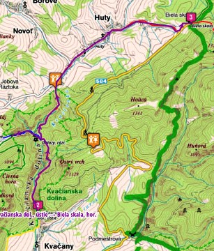 (Brnice - ohne Markierung - Prosiek – Prosiecka dolina - gelbe Markierung -) Kvacany – rote Markierung - Kvacianska dolina – Huty - Biela Skala (Übernachtung, Bushaltestelle)