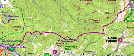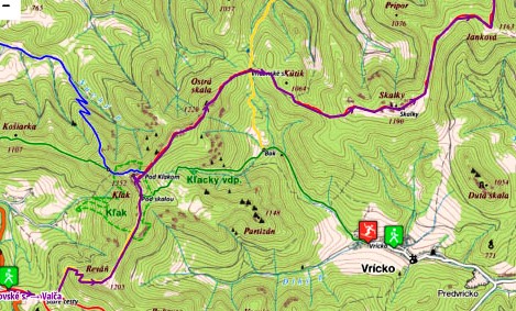 Fackovske sedlo - rote Markierung - Stare cesty- gelbe Markierung - Revan - Pod skalou - Klak - rote Markierung - Pod Klakom - Ostra skala - Vricanske sedlo - Skalky - Jankova - Sedlo pod Uplazom - blaue Markierung - Zraz - grüne Markierung - Valca - ohne Markierung - Benice (Übernachtung, Bushaltestelle, Bahnstation Pribovce - Rakovo)