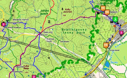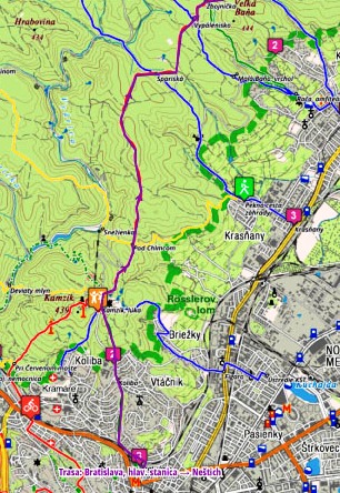 Bratislava hl. nadrazi (Hauptbahnhof) - grüne Markierung - Koliba - Kamzik luka - rote Markierung - Pod Chlmcom - Spariska - Vypalenisko - Zbojnicka - Biely kriz - gelbe Markierung - Sväty Jur (Übernachtung)