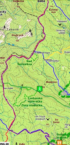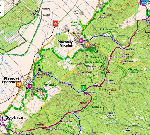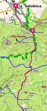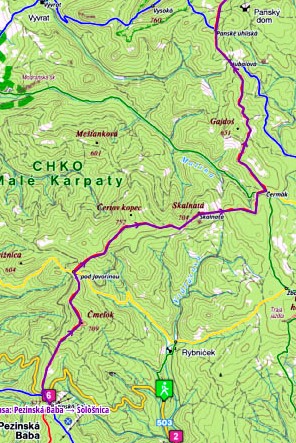 Solosnica - grüne Markierung - Pod Malou Vapennou - rote Markierung - Vapenna (Rostun) - Mesacna luka - Sedlo Uhliska - Amonova luka - Kubasova - Mon Repos - Pod Ciernou Skalou - Cervena hora - Brezinky, razc. - Razc. pod Ostrym Kamenom - gelbe Markierung - Bukova, v. n. (Campingplätze, Bushaltestelle)
