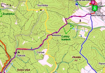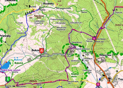 Bukova - gelbe Markierung - Razc. pod Ostrym Kamenom - rote Markierung - Ostry kamen - Zaruby - Havranica - Havrania skala - Bukova, kamenolom - Vitkov Mlyn - Dolna Rakova - Mihalinova - Dobra Voda (Übernachtung)