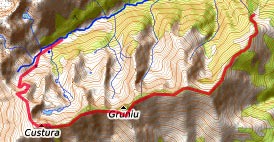 Poiana Pilugu Mare - in Richtung S zum Hauptkamm hoch - hier nach rechts, alte Markierungen rotes Band und gelbes Kreuz - Vf. Custura (2457 m), kurz danach nach rechts, Markierung gelbes Kreuz - Fereastra Custurii, nach rechts, Markierung blaues Dreieck - Refugiul Stana de Rau (Übernachtung in einfacher Biwakhütte)