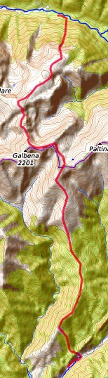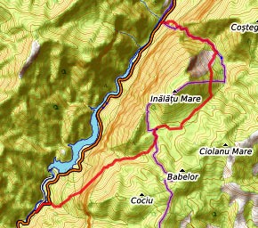 Cabana Rotunda - auf dem Fahrweg fast 400 m wieder talaufwärts - ab jetzt ohne Markierung nach rechts in das Seitental Richtung S - teils auf Pfaden, teils weglos auf die Hochweiden am Vf. Nedeia - Richtung SW über die Hochebene Borascu - nach S zum Vf. Galbena - nach links, für kurze Zeit markiert mit dem roten Band - am Muntele Gardomanu nach rechts, Markierung rotes Dreieck- auf dem Bergkamm Richtung S bis zur Hochweide in Höhe 1170 m - hier nach links und auf Waldpfaden hinunter zur Quelle der Cerna - am Fahrweg nach rechts oder links zu den Quartieren am nördlichen Ende des Cerna-Stausees (Übernachtung)