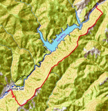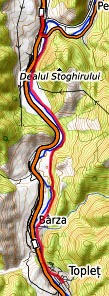 Gara Herculane - zunächst entlang der Hauptstraße DN vom Bahnhof etwas mehr als 500 m Richtung S / Orsova - nach links in die Str. Pecinisca Richtung Baile Herculane - gleich nach der Brücke über die Cerna nach rechts auf den Fahr-/Feldweg entlang der Cerna - auf diesem Weg links der Cerna über Barza nach Toplet (Übernachtung, Bahnstation, Bushaltestelle)