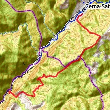 Cerna-Quelle/Izvoarele Cernei - zurück zur Brücke über die Cerna - kurz nach rechts, dann nach links in den Wald und auf Vieh- und Holzwegen Richtung SO auf den Bergkamm - oben nach rechts und konsequent auf dem Kamm Richtung SW, Markierung rotes Band - zunächst lange im Wald, dann über Hochweiden, bis der mit dem roten Dreieck markierte Wanderweg kreuzt - hier nach rechts und der Markierung auf Feld- und Waldwegen nach rechts hinunter ins Cerna-Tal folgen - Cerna-Dorf/Cerna-Sat (Übernachtung)