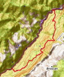 Cerna-Dorf/Cerna-Sat - hinüber zur kleinen Häusergruppe SO des Weihers - auf dem Talweg ca. 350 m Richtung SW - nach links und auf Wald- und Wiesenpfaden (Markierung blaues Dreieck???) hinauf zum Bergkamm - nach rechts und auf dem Kammweg Richtung SW, Markierung rotes Band - nach ca. 6 km rechts über die Wiesen zum Aussichtspunkt Ciucelele und weiter unter den Felsen hinunter ohne Markierung ins Cerna-Tal, oberes Ende der Cheile Bobotului (Übernachtung in der Nähe, evtl. Abholung mit Privat-Pkw)