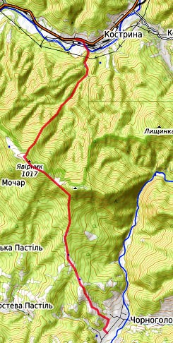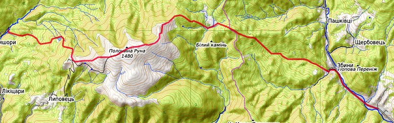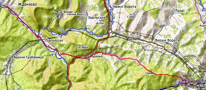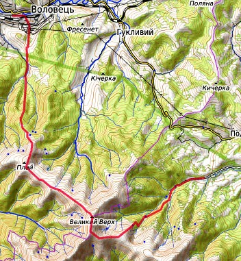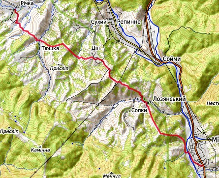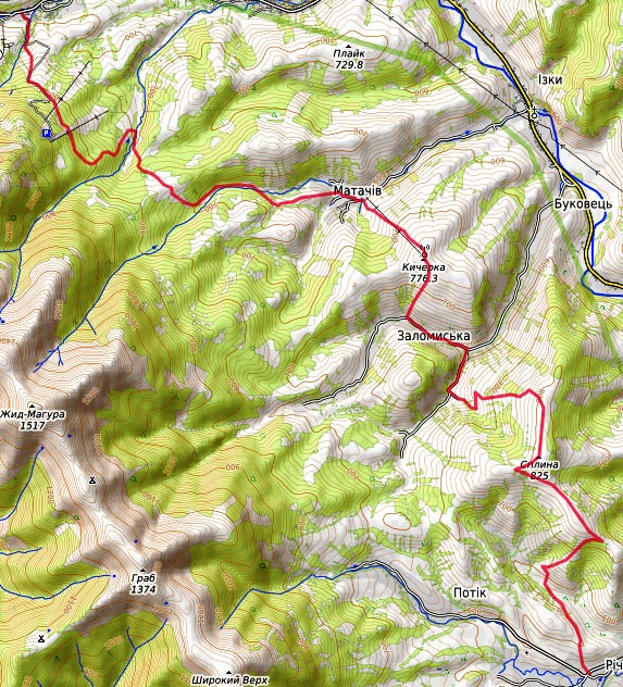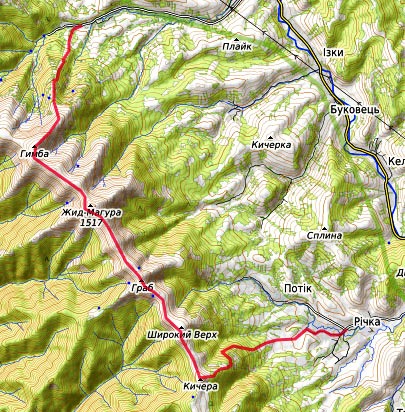 Pylypez - Richtung S teils auf der Straße zum Skigebiet Mahura, teils die Kehren abkürzend - das Skigebiet queren - hinunter ins Tal des Pylyptsyk - kurz talaufwärts - nach etwa 200 m links (Richtung SO) hoch auf den Hügelkamm - hinunter ins nächste Tal - abwärts - am Friedhof vorbei nach Matatsiv - den Skihang hoch zum Kytserka - hinunter ins Tal von Zhalomyska - etwa 700 m aus dem Fahrweg talabwärts - nach rechts, 500 m talaufwärts - links hoch auf den Hügel Splyna (825 m) - etwa Richtung S0 hinunter nach Ritschka (Übernachtung?)