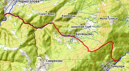 (Taxi nach Tschornoholowa) Am Ortseingang nach Westen in das Tal des Batschava-Baches - auf der Straße bis Bukiwzovo - rechts oben kommt die Holzkirche in Sicht - nach rechts über den Bach - hoch zur Holzkirche - um die Kirche herum - nächster Weg nach rechts Richtung SO, bergan - durch den Wald hoch auf den Bergkamm - auf dem Kammweg nach links Richtung NO - nach 1,9 km Waldweg nach rechts abwärts ins Tal - Lumschory (Übernachtung, Turbasa)