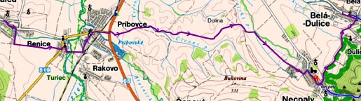 Ohne Markierung: Valca - auf der Hauptstraße Richtung O - kurz vor dem Gasthaus Dolna Pohoda nach rechts, Asphaltstraße zum Ortsrand, dann erster Feldweg nach links bis Benice - an der Hauptstraße kurz nach links, gleich wieder nach rechts, am Schloss wieder nach rechts - nach 100 m links - Fußweg zum Bahnhof Pribovce-Rakove - hier links bis zur Kirche und zum Rathaus - hier rechts nach - über die Bahn - zur Hauptstraße - leicht nach links versetzt zur Einmündung des Feldwegs queren - nun auf Feldwegen grob Richtung O nach Necpaly - durch den Ort - am Hauptplatz nach links - auf der Straße nach Bela-Dulice (Übernachtung, Bushaltestelle)