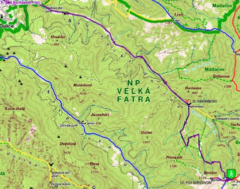 Bela Dulice - grüne Markierung - Slavkova dolina, ustie - Belianska dolina - Havranovo - Sedlo pod Borisvom - gelbe Markierung - Borisov (1510 m) und zurück - Chata pod Borisovom (Übernachtung)