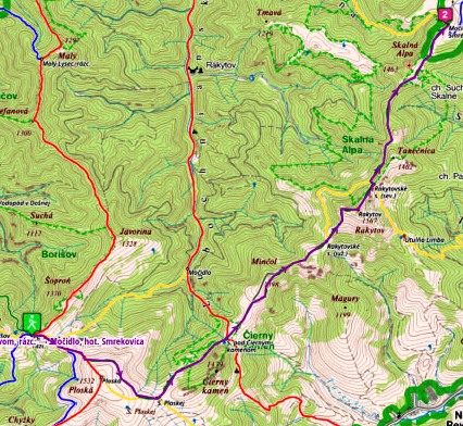 Chata pod Borisovom - rote Markierung - Ploska - gelbe Markierung - Sedlo Ploskej - grüne Markierung - Cierny kamen / Sedlo pod Ciernym kamenom - Rakytov (1567 m) - Skalna Alpa - Mocidlo, horsky hotel Smrekovica oder weiter zum Hotel Granit (Übernachtung)