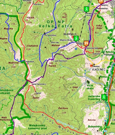 Smrekovica - grüne Markierung - Mala Smrekovica - Nizne Siprunske sedlo - rote Markierung - Vysne Siprunske sedlo - grüne Markierung - Sedlo pod Vtacnikom - Malinne - Sedlo Borovnik / Sidorovo - gelbe Markierung - Vlkolinske luky - blaue Markierung - Pod Kalvariou - Kalvaria - Ruzomberok (Ü)