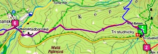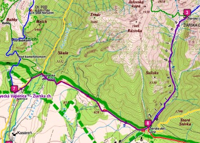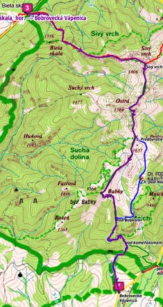 Biela skala (Bushaltestelle) – rote Markierung - Sivy vrch (1806 m) – grüne Markierung - Ostra - sedlo Predovratie - Babky - Pod Babkami - blaue Markierung - Nad kamenolomom - Bobrovecka Vapenica bei Jalovec (Übernachtung)
