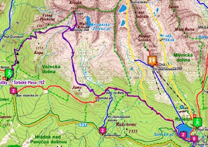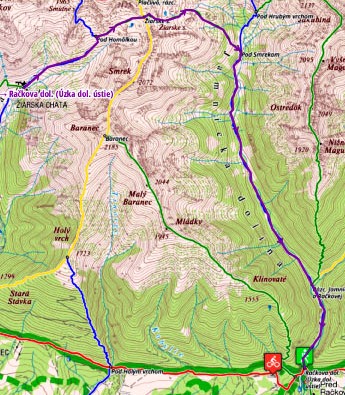 Ziarska chata - blaue Markierung - Pod Homolkou - grüne Markierung - Ziarske sedlo - Pod Smrekom - blaue Markierung - Jamnicka dolina – Racz. Jamnickej a Rackovej - Uzka dolina - Rackova dolina / Uzka dolina, ustie / Pred Rackovou (Übernachtung)