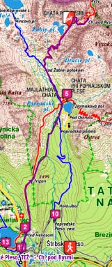 Strbske Pleso - rote Markierung - Pred Heliosom - Trigan - grüne Markierung (einfacher) oder rote Markierung (interessanter) - Popradske pleso - blaue Markierung - Nad Zabim Potokom - Chata pod Rysmi (Übernachtung)