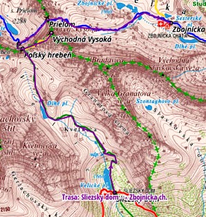 Achtung: Am Polski Hreben und vor allem am sedlo Prielom ausgesetzte Abschnitte mit Kettensicherungen, Schwindelfreiheit und Trittsicherheit erforderlich! Sliezsky dom / Schlesierhaus – grüne Markierung - Polski hreben / Polnischer Kamm – Abstecher: gelbe Markierung zur Vychodna Vysoka (2429 m) und zurück zum Polski Hreben - grüne Markierung - Abstieg auf der Nordseite - nach rechts / blaue Markierung - sedlo Prielom – Zbojnicka chata / Räuberhütte (Übernachtung)